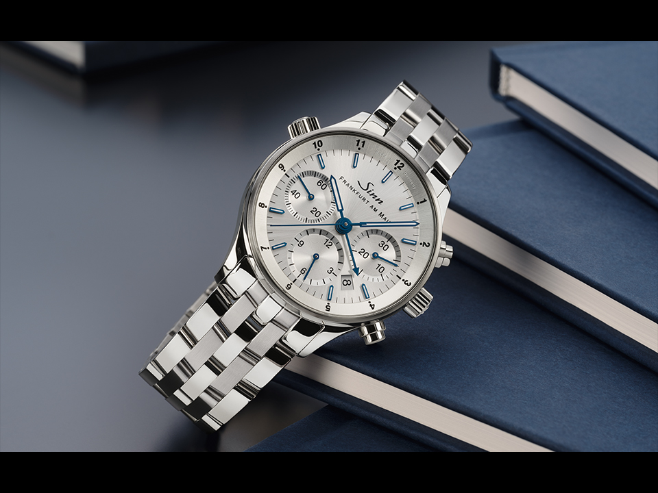 Die auf 250 Stück limitierte Frankfurter Finanzplatzuhr 6000 Jubiläum III verkörpert Eleganz, technische Raffinesse und eine besondere Verbindung zu Frankfurt am Main, dem Hauptsitz von Sinn Spezialuhren. Durch das Saphirglas zeigt sich das galvanisch versilberte Zifferblatt.