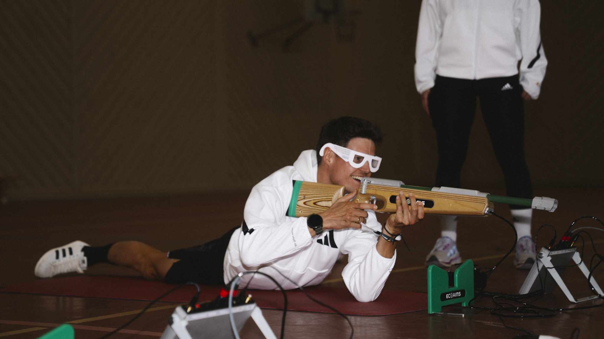 In der Mehrzweckhalle legt sich Philipp auf den Boden. Genau wie im Wettkampf aber doch irgendwie ganz anders. Denn es herrscht absolute Stille. Nur ein eindringlicher, elektronischer Ton durchbricht die Ruhe. Im Para-Biathlon orientieren sich die sehbeeinträchtigten Athletinnen und Athleten nicht am Zielbild, sondern am Klang der Schießanlage. Je höher der Ton, desto präziser das Ziel.